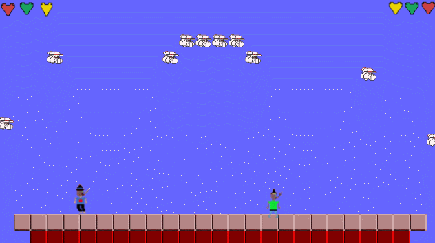 Duel is a two-player fighting game. The left player moves and jumps using the WASD keys. The right player moves and jumps using the arrow keys. Jump on your opponent's head three times to win. Press Escape to restart the game.
